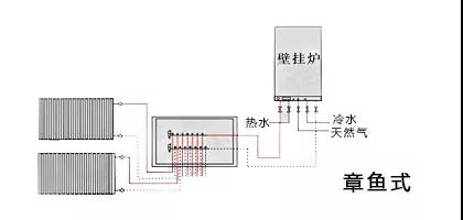 章魚式的供水方式,是由壁掛爐加熱后的水,通過(guò)一個(gè)集分水器,然后由集分水器,分別通過(guò)幾段管路,像對(duì)應(yīng)的暖氣片供熱,每個(gè)暖氣片都是單獨(dú)的回路。